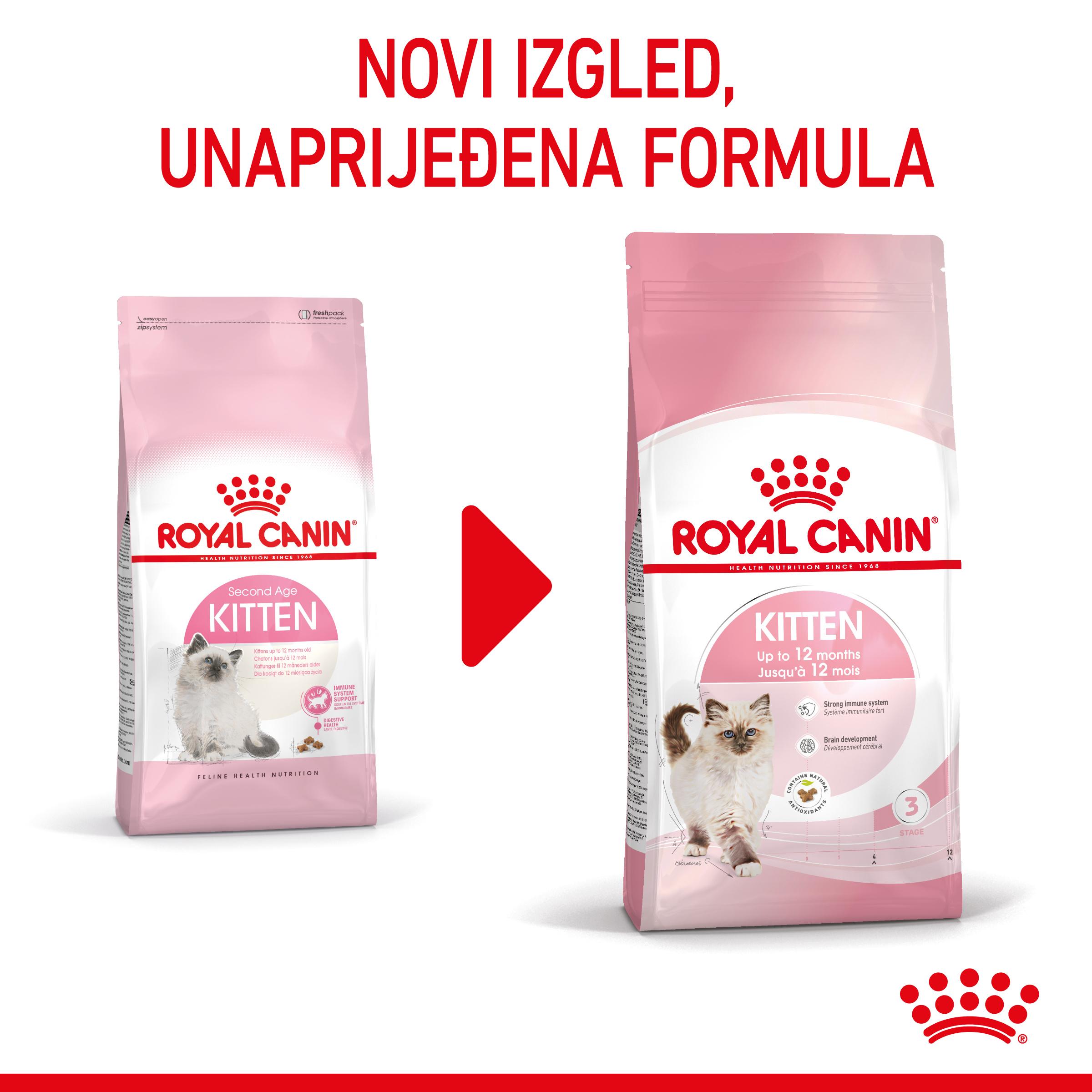 ROYAL CANIN® Kitten proizvod je posebno formuliran kako bi se zadovoljile prehrambene potrebe mačića u “fazi očvršćivanja” tijekom rasta. Ova formula je prikladna za mačiće u dobi od 4 do 12 mjeseci, razdoblju kada prolaze kroz značajne fizičke promjene i promjene u ponašanju.