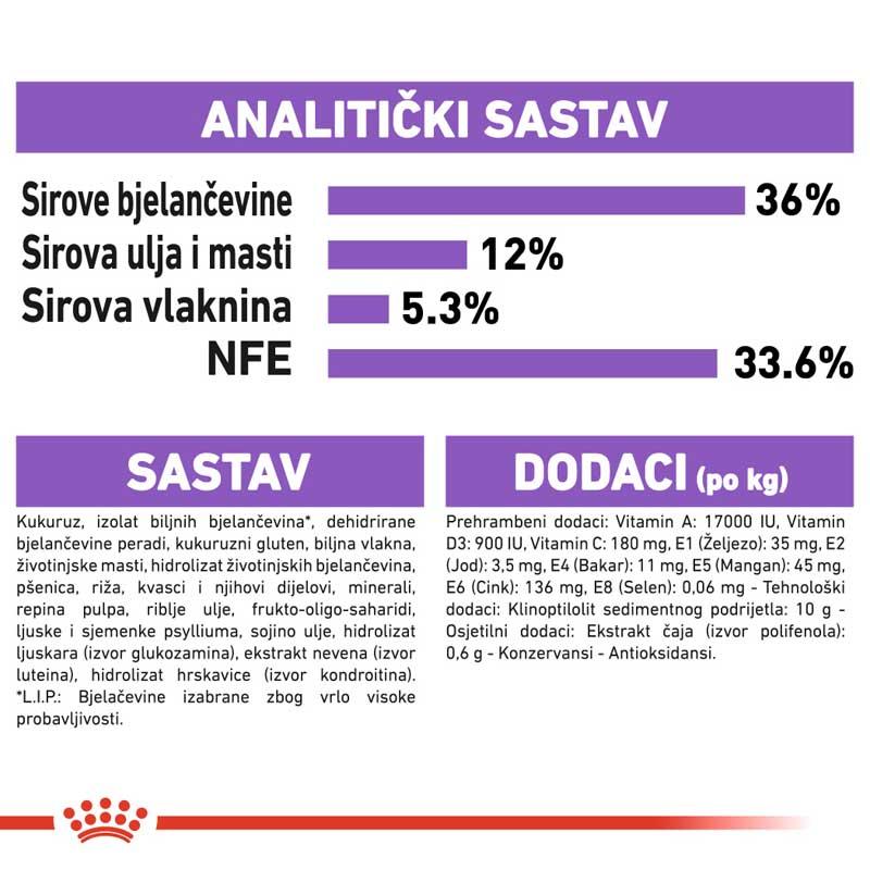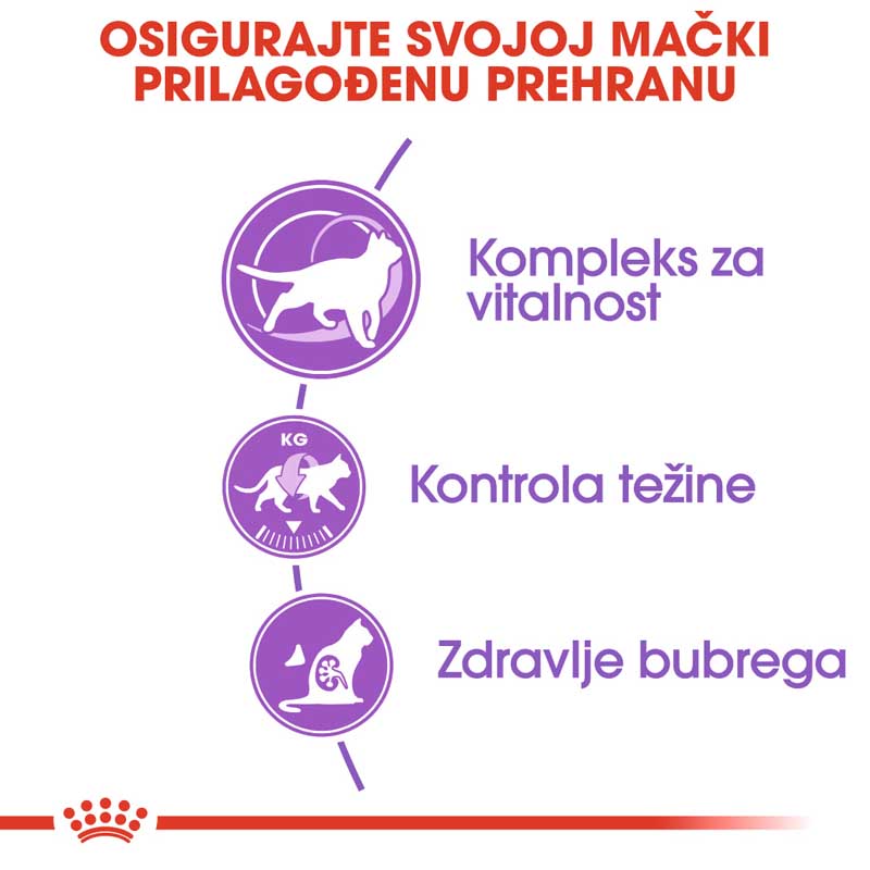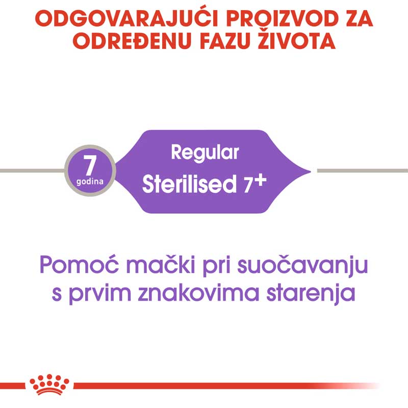 ROYAL CANIN® posvećen je pružanju prehrambenih rješenja za potrebe vašeg kućnog ljubimca. Svi naši proizvodi prolaze opsežan postupak kontrole kvalitete kako bismo zajamčili najvišu kvalitetu hrane, ali i zadovoljili posebne prehrambene potrebe te način života vaše mačke. To znači da je hrana ROYAL CANIN® Sterilised 7+ dovoljna za potpunu i uravnoteženu prehranu vaše mačke.