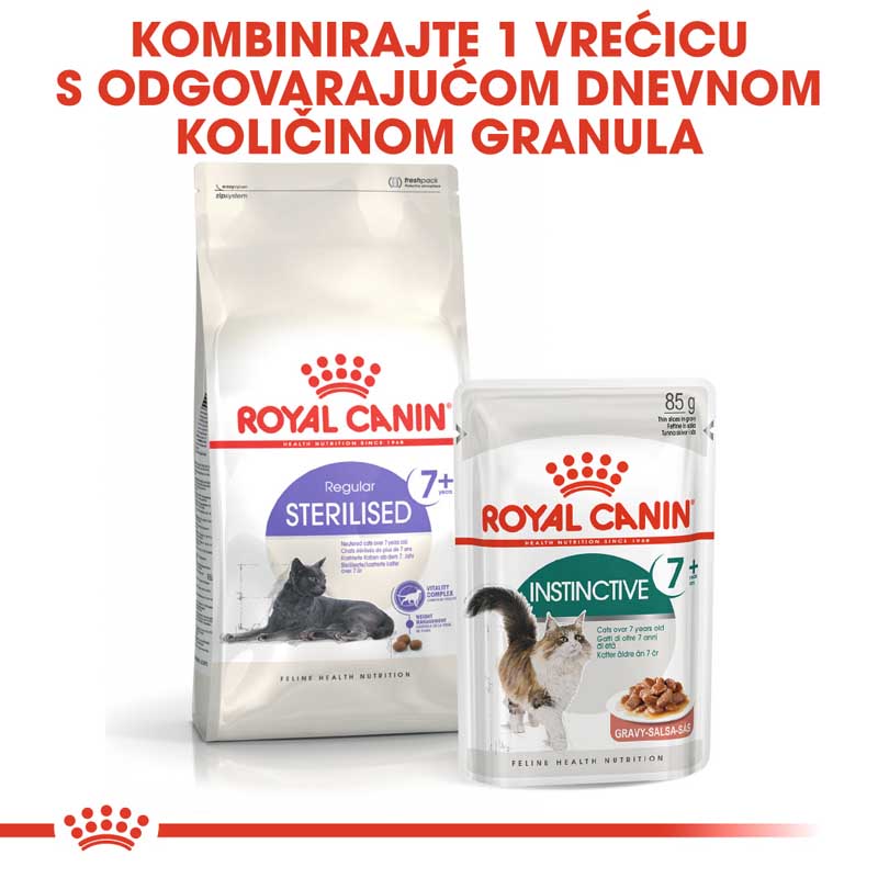 Hrana ROYAL CANIN® Sterilised 7+ posebno je formulirana kako bi zadovoljila sve prehrambene potrebe vaše odrasle mačke, a prikladna je za sterilizirane/kastrirane mačke starije od 7 godina.