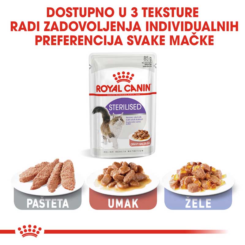 Kako bi se zadovoljile potrebe svake mačke, ROYAL CANIN® Sterilised može se pronaći u mokroj formuli – u obliku meke i ukusne paštete ili slasnih komadića u umaku – te u obliku suhe hrane. Ako razmišljate o kombiniranoj prehrani, slijedite naše smjernice za hranjenje kako biste bili sigurni da će vaša mačka dobiti odgovarajuću količinu mokre i suhe hrane za optimalnu korist.