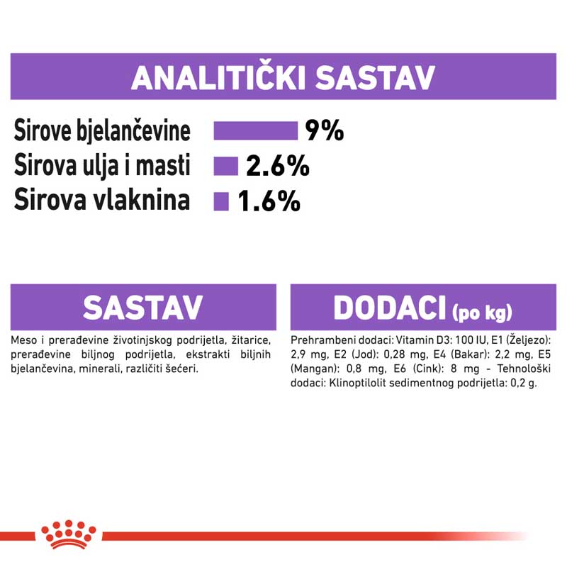 ROYAL CANIN® posvećen je pružanju prehrambenih rješenja za potrebe vašeg kućnog ljubimca. Svi naši proizvodi prolaze opsežan postupak kontrole kvalitete kako bismo zajamčili najvišu kvalitetu hrane, ali i zadovoljili posebne prehrambene potrebe te način života vaše mačke. To znači da je hrana ROYAL CANIN® Sterilised in Jelly dovoljna za potpunu i uravnoteženu prehranu vaše mačke.